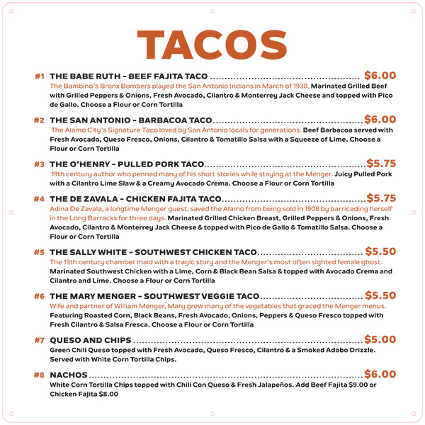 Located just a stone's throw away from the iconic Alamo, Mengerita Tacos is a delightful eatery that captures the vibrant essence of Tex-Mex cuisine in San Antonio, TX. This hidden gem has quickly established itself as a go-to destination for taco lovers, offering a menu that showcases bold flavors and satisfying dishes.